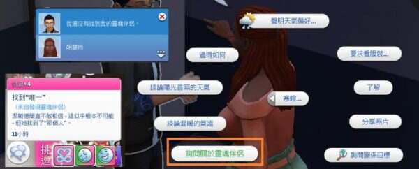 灵魂伴侣在彼此互动时会获得调情增益,而在与其他模拟市民调情时会获得紧张或悲伤的增益。还有一个「询问灵魂伴侣」互动,可以用来询问对方是否找到了他们的灵魂伴侣。
